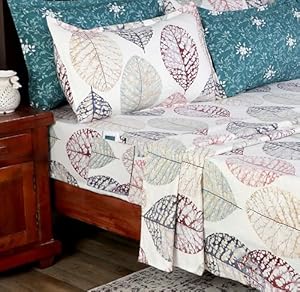 White Green Leaf Printed King Size, Bedsheet Set with 2 Pillow Covers