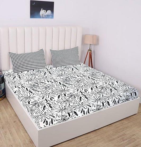 White Black Pattern Elastic Fitted Bedsheet King Size with 2 Pillow Covers